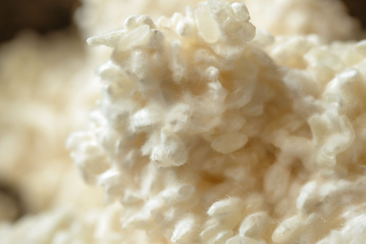 用蒸熟的大米繁殖“Koji菌”制作的米麹。毛茸茸的白色菌丝覆盖在大米表面