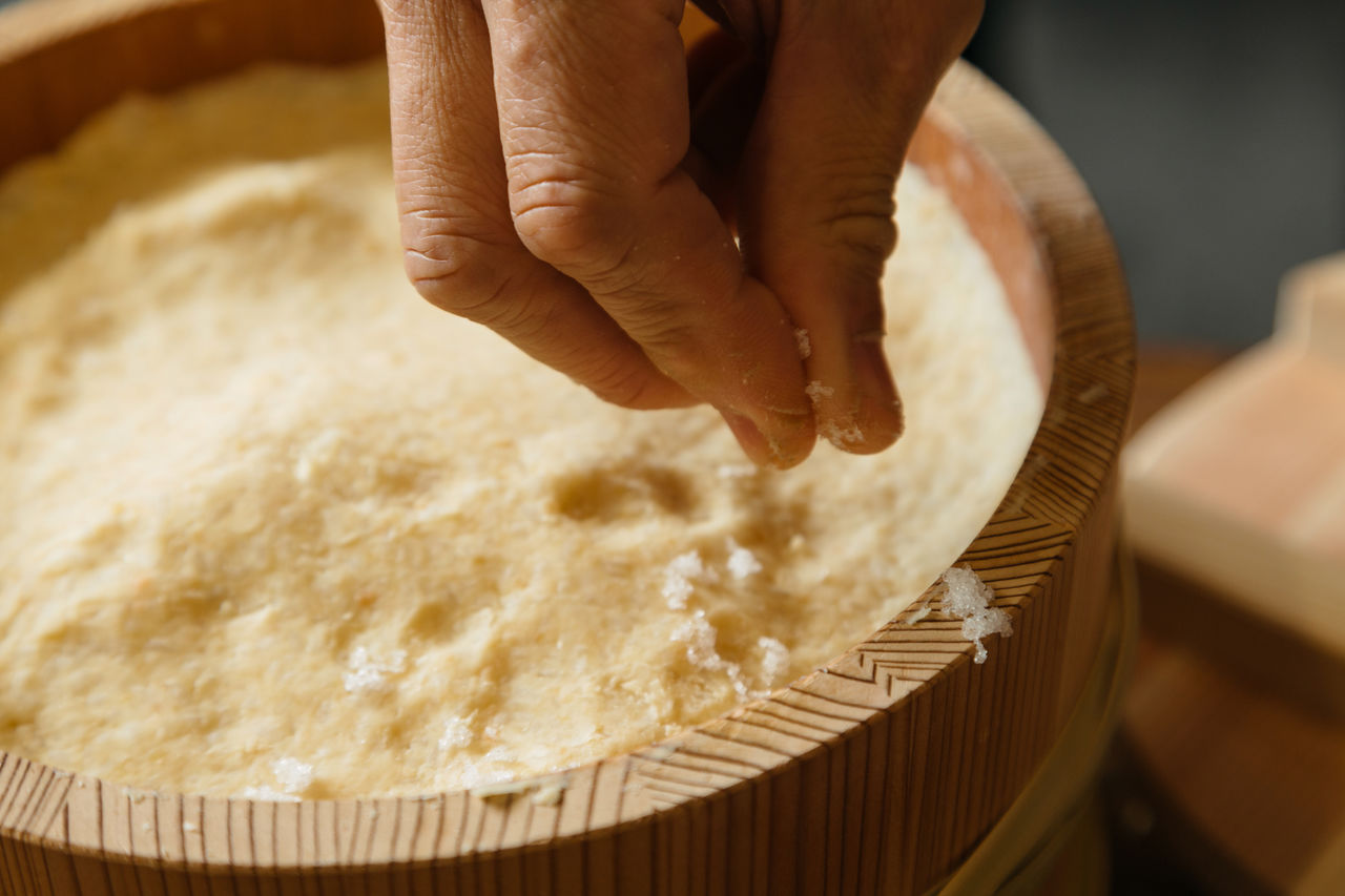 接着,把混合好的原料揉成棒球大小的“味噌团子”,并塞进容器里。据说揉成球状这个步骤,可以将里面的空气排出。之后,在容器中将味噌团子按扁压平。