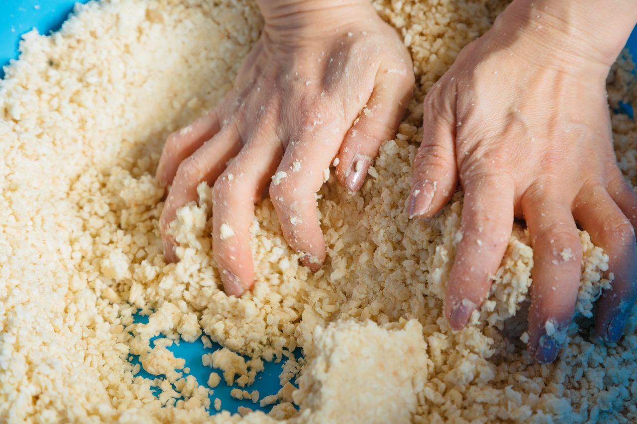 接着,在一个大盆里加入米麹和盐(总量的10-13%),用手耐心拌匀。