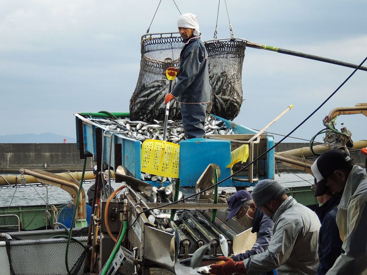 其中主要鱼种青花鱼通过类似传送带的机器,从渔船上源源不断地传送出来,等候在那里的渔港工作人员根据大小进行分选,然后装进鱼箱中。这些青花鱼有的被送往东京等城市,有的在当地加工,用途多种多样。