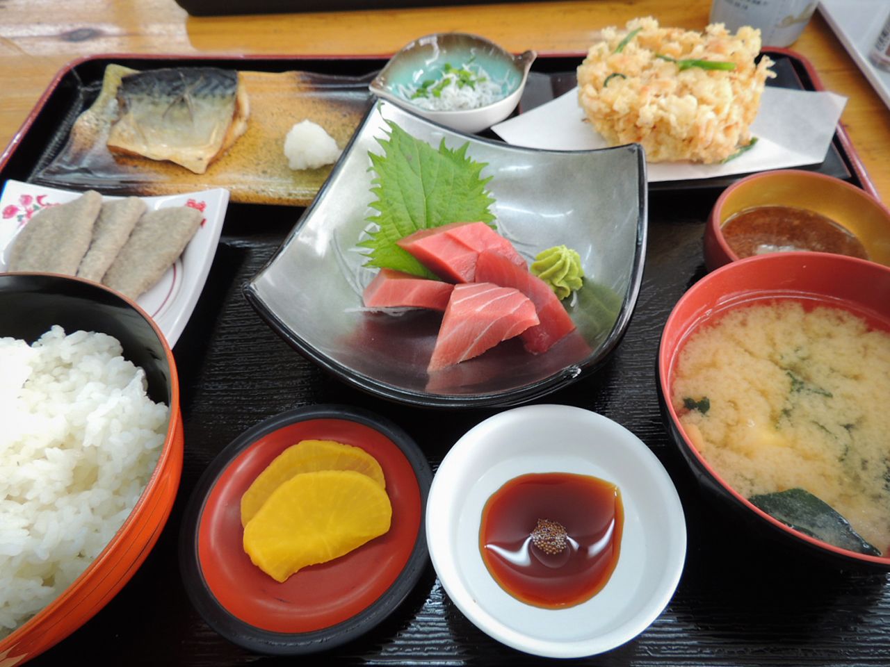 据店员介绍,店里排名前三的是“骏河套餐”“刺身拼盘套餐”和“海鲜盖饭”。最贵的“骏河套餐”1600日元,口感无可挑剔。金枪鱼的刺身和樱虾炸什锦、盐烤青花鱼、小沙丁鱼干、还有用鱼肉糜加工而成的静冈名产“黑半片”,一份套餐即可饱尝烧津和小川的美味。