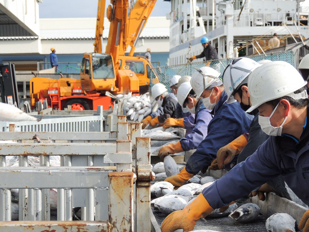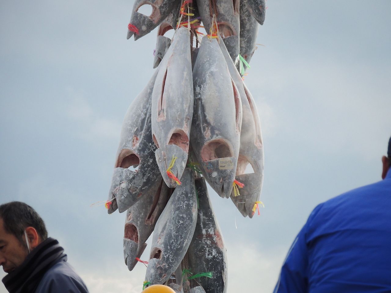 远洋捕获的冷冻金枪鱼也很多,鱼尾被绳子绑在一起的蓝鳍金枪鱼大量卸船后,可以看到工作人员静静地进行分类并往卡车上装货的情景。
