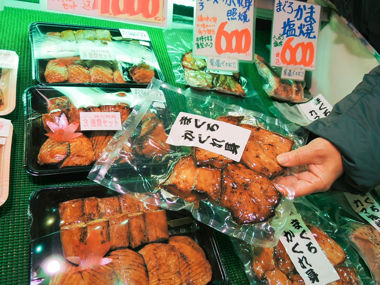 生鲜鱼贝类和干咸鱼加工品当然少不了,家常菜、调味料等商品也是琳琅满目,将狭小的店面摆得满满当当。在售卖金枪鱼各部位的定长商店,除了腹部(大肥下边)和下巴,还将头部的肉进行“照烧”加工,制成袋装产品出售。乌贼、竹荚鱼、青花鱼、红金眼鲷等干货的售价也比较合理,用特产樱虾和芥末加工的商品也很丰富。