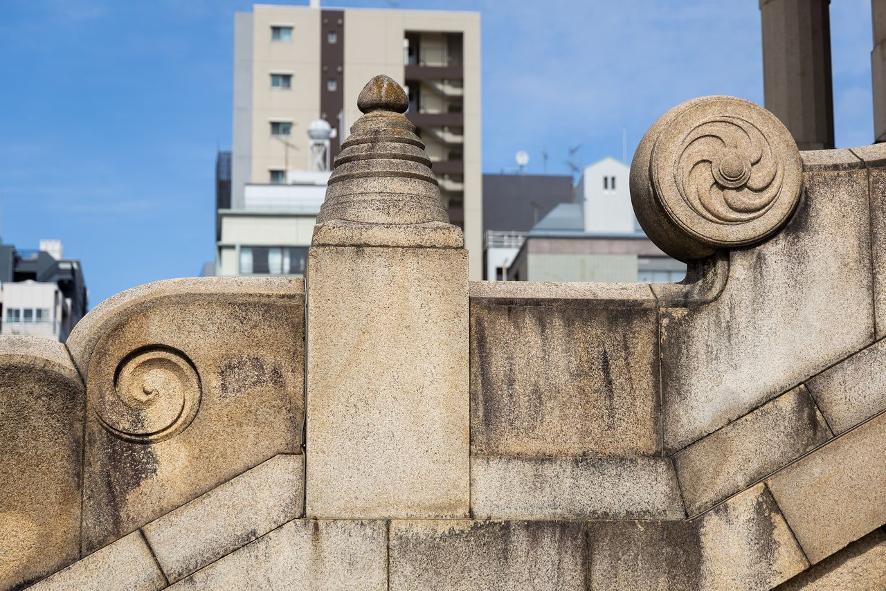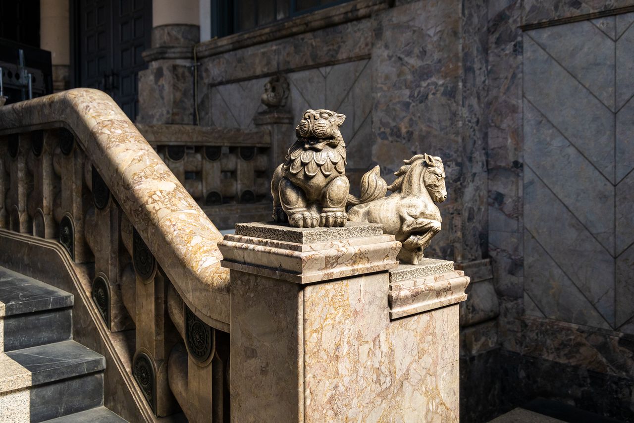 这里还有绝对值得关注的“动物雕塑”。伊东因其对动物和妖怪的喜爱而闻名,他对神社的狛犬等的设计也非常独特。坐落在筑地本愿寺正殿前的狮子还有翅膀。不仅让人联想到狮身人面像,也能看出古代东方的影响,而石阶下的两只狮子和石阶上的两只狮子左右对称,嘴巴各自呈现为“阿”和“吽”发音形状,因其融入了狛犬的元素,显得非常有趣。