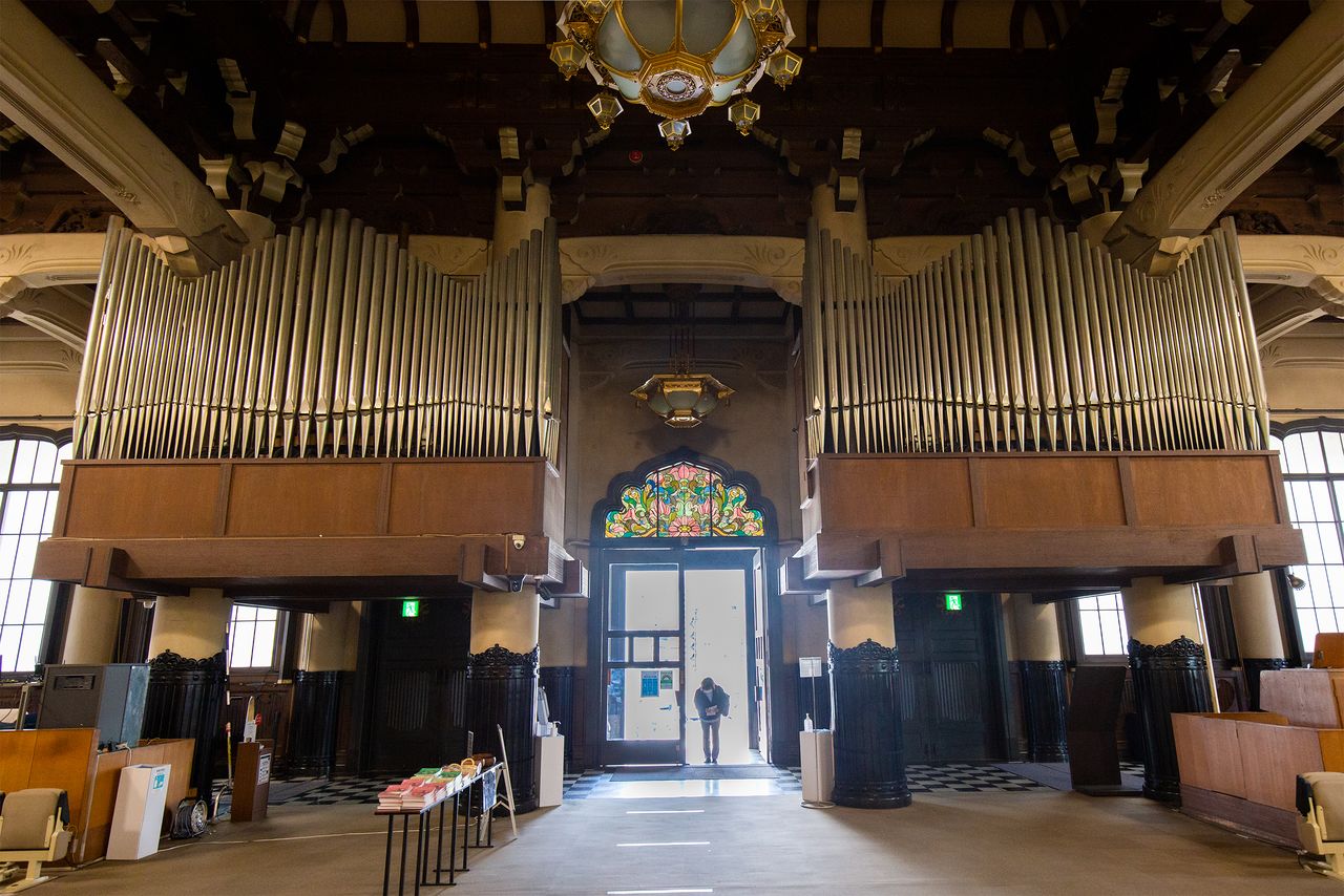 天花板的吊顶组件等是日式风格。在竣工当时的时代,一般信众坐在椅子上参拜是件稀罕事。殿内的柱子底部黑色部分就是蒸汽加热装备
