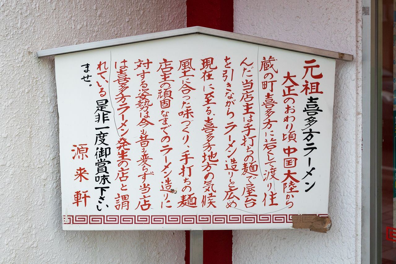 创建者是大正末期从中国来日的藩钦星。据说他在长崎和横滨打了一段时间工之后,来投奔在喜多方西北的加纳矿山工作的叔父,但却没找到活干,于是就摆摊卖起了中华荞麦面。他一边回忆着故乡的味道,一边自己不断钻研,后来就创办了源来轩。