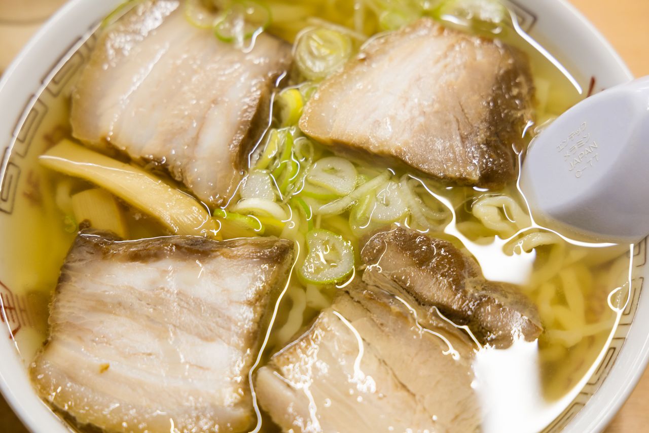 金黄色的盐味汤底。有不少人为了一尝“元祖”坂内的味道,专程来喜多方游玩