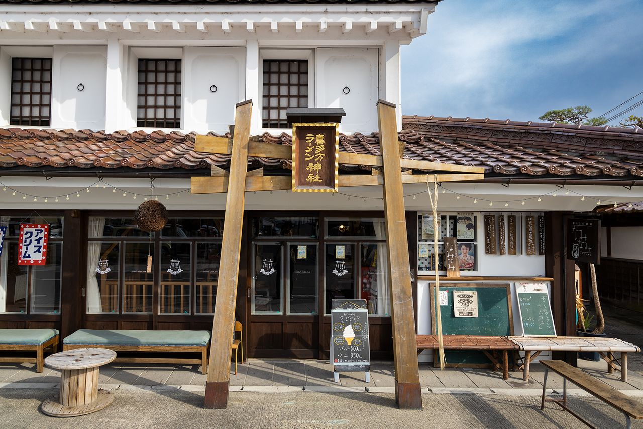 怀旧小巷商店街的喜多方拉面神社。土特产琳琅满目的店内供奉着拉面碗