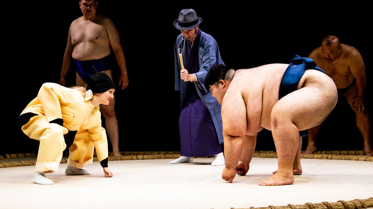“四股”(左右两脚交替高举用力踏地——译注)等动作和“上手投”这种决胜招数的展示动人心魄,这也只有经过严格训练的真正的相扑力士才能做到。相扑比赛中的禁忌则用一种搞笑的方式来展现。这是大相扑中为人熟知的“初切”表演环节。旁白和灯光为表演增色不少,令全场沸腾。