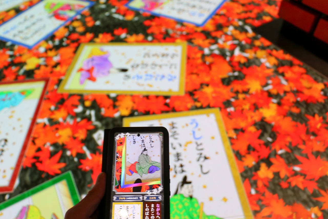 任天堂靠生产纸牌“花札”起家,是一家创立于明治时代的百年老店。在开展电子游戏业务前,主营产品除花札外,还有扑克牌、竞技歌牌“百人一首”、制作精良的玩具等。在介绍这些创业历程的时雨殿专区,观众脚下的巨型显示屏显示着百人一首的歌牌,用专门的智能手机可在此对战一番。