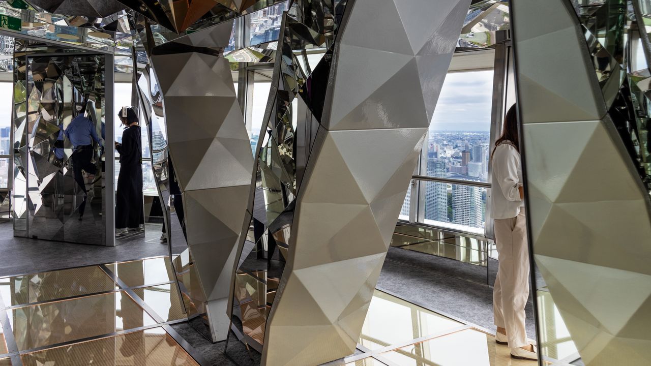 东京塔(高333米)250米高处的观景台“顶层甲板(TOP DECK)”焕然一新。6年前改造时,观景台的天花板和立柱上安装了几何形镜面,本次改造又在地板上铺设了发光榻榻米,将整个观景台打造成一个闪闪发光的空间。