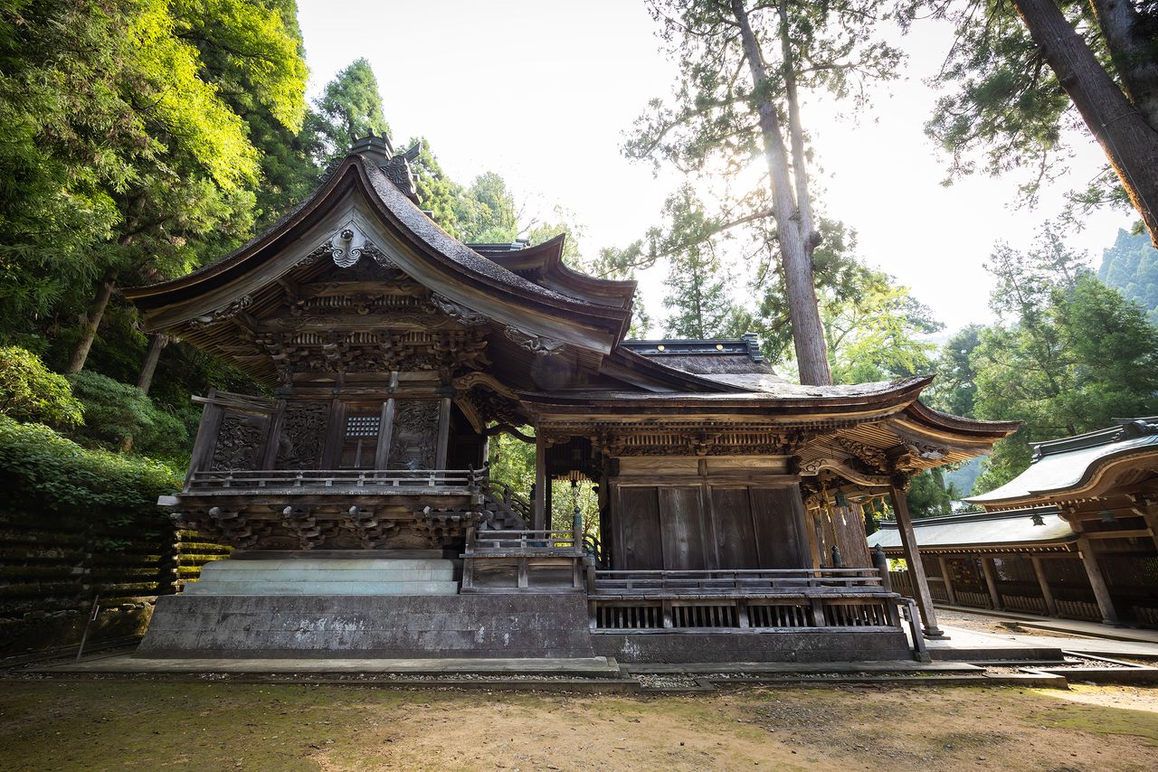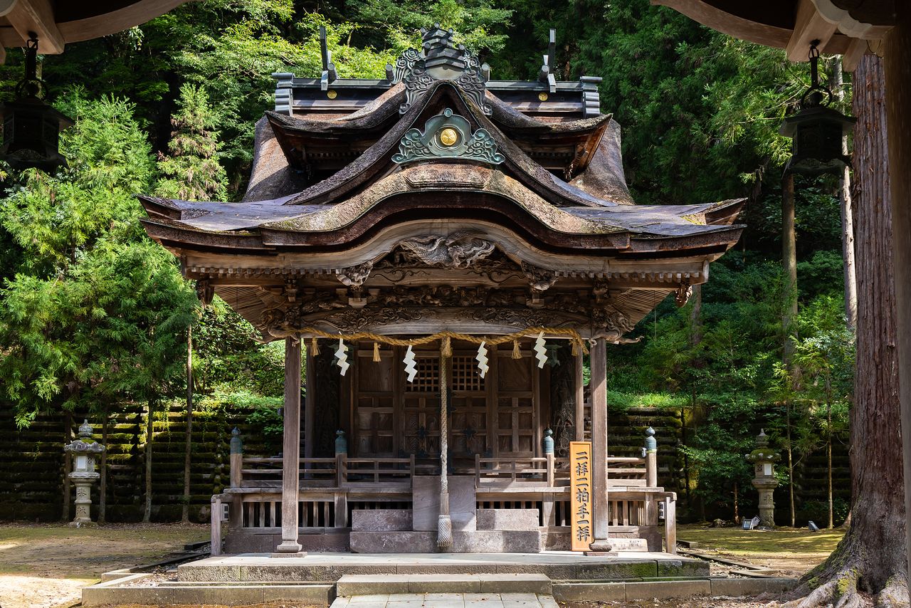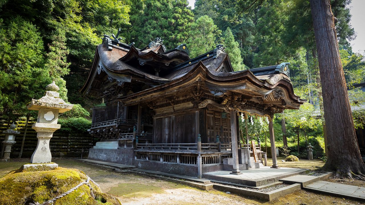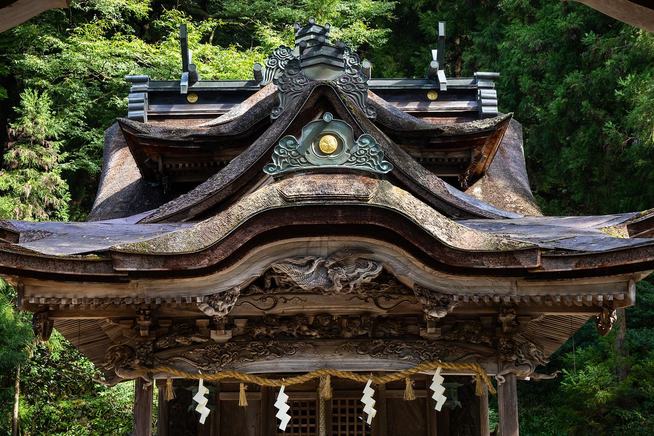 正殿与拜殿合二为一并不罕见,但多重曲线重叠的屋顶给人强烈的视觉冲击。正殿的正面屋顶向前方延伸呈弧线,柱间距离约为1.8米,拜殿采用歇山顶构造,入口在与屋顶坡面垂直的侧面。在正殿和拜殿相连接的屋顶上,并列饰有圆润的唐破风和三角形的千鸟破风两种装饰,被称为“日本最复杂的屋顶”。