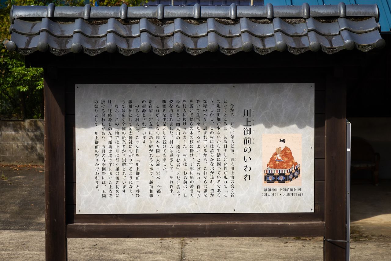 她未透露姓名,只留下一句“我住在川上(河流上游——译注)”变消失了。后来,村民们纷纷开始制作和纸,并将这位神秘女性尊称为川上御前,作为“纸祖神”供奉于冈太神社。