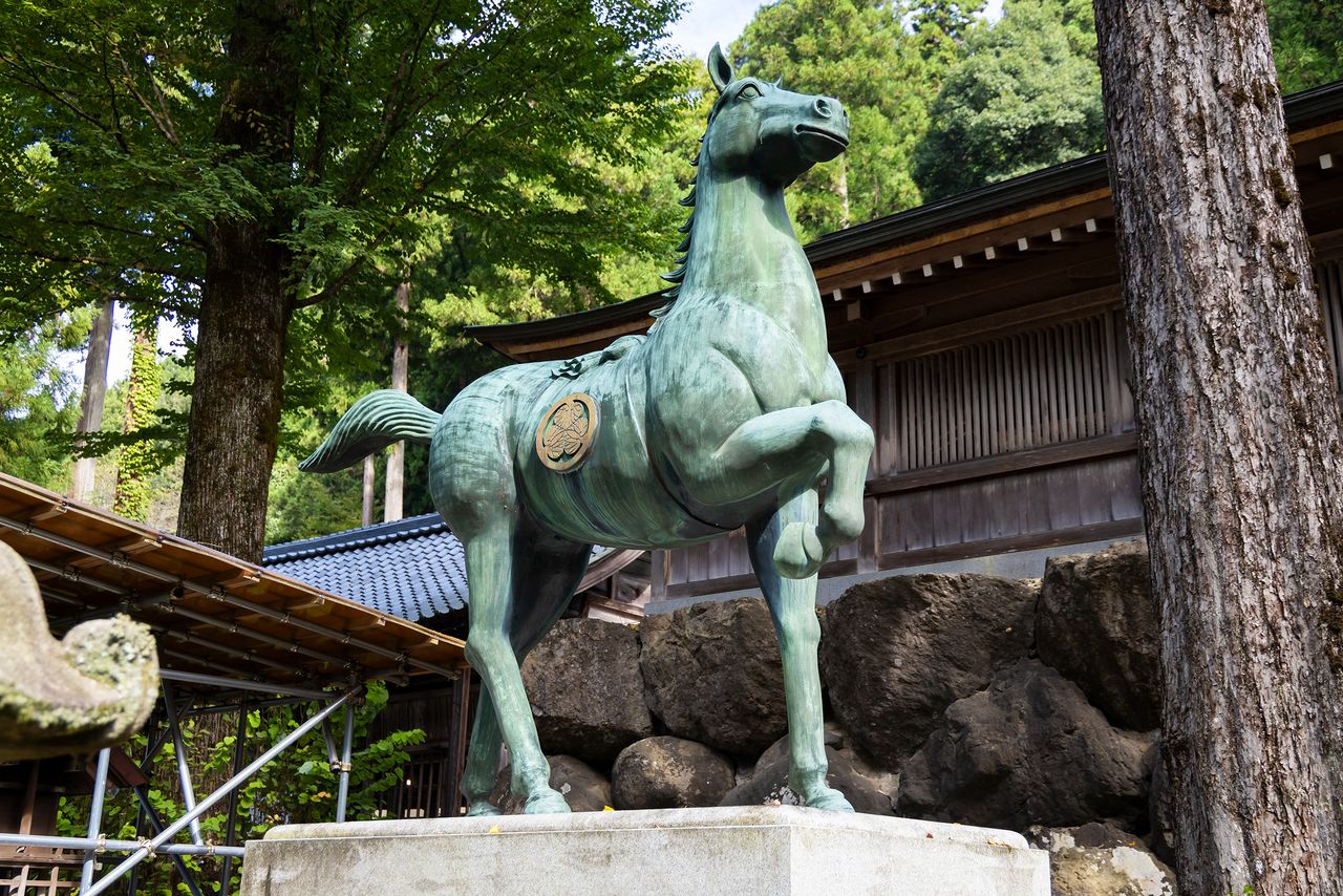 社殿和神马雕像上有“三叶葵”纹章,代表了江户时代藩主越前松平家的深厚信仰