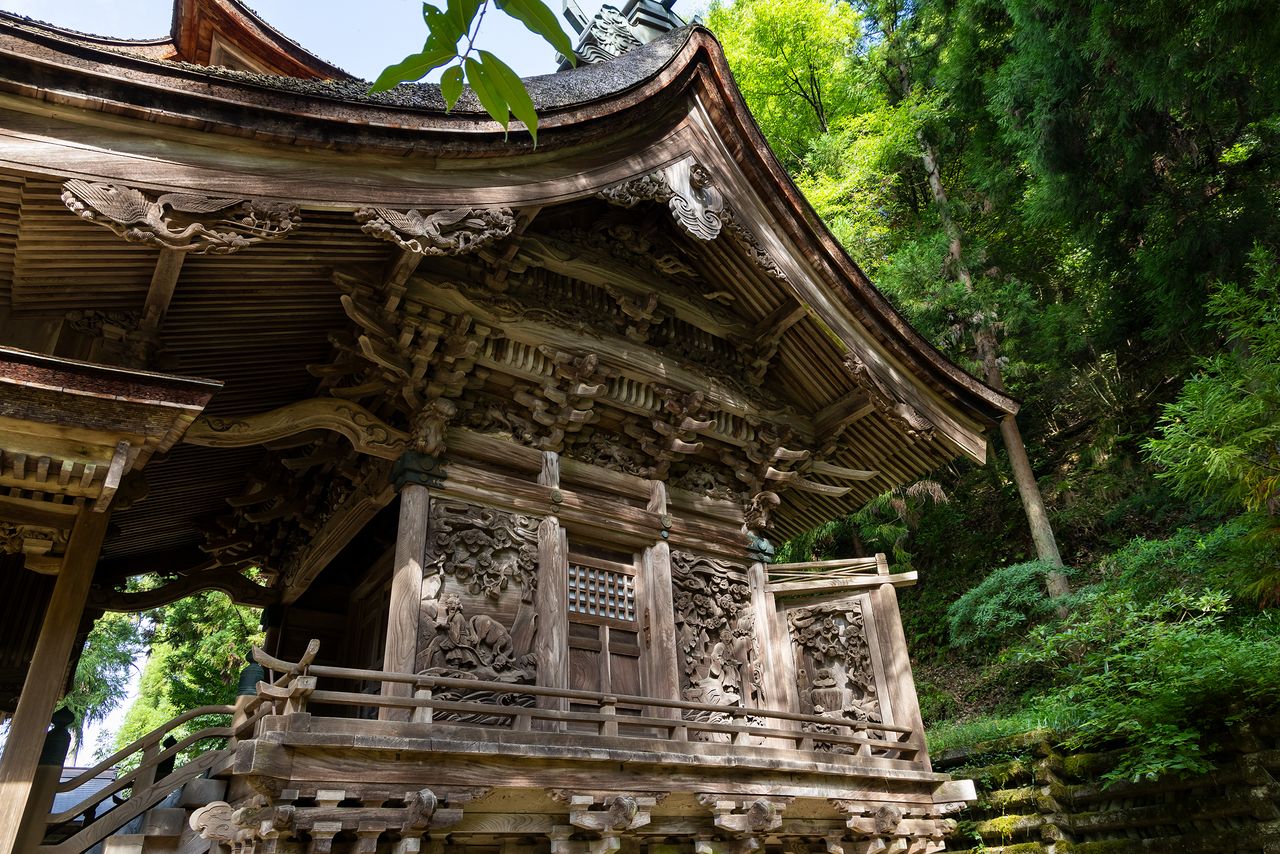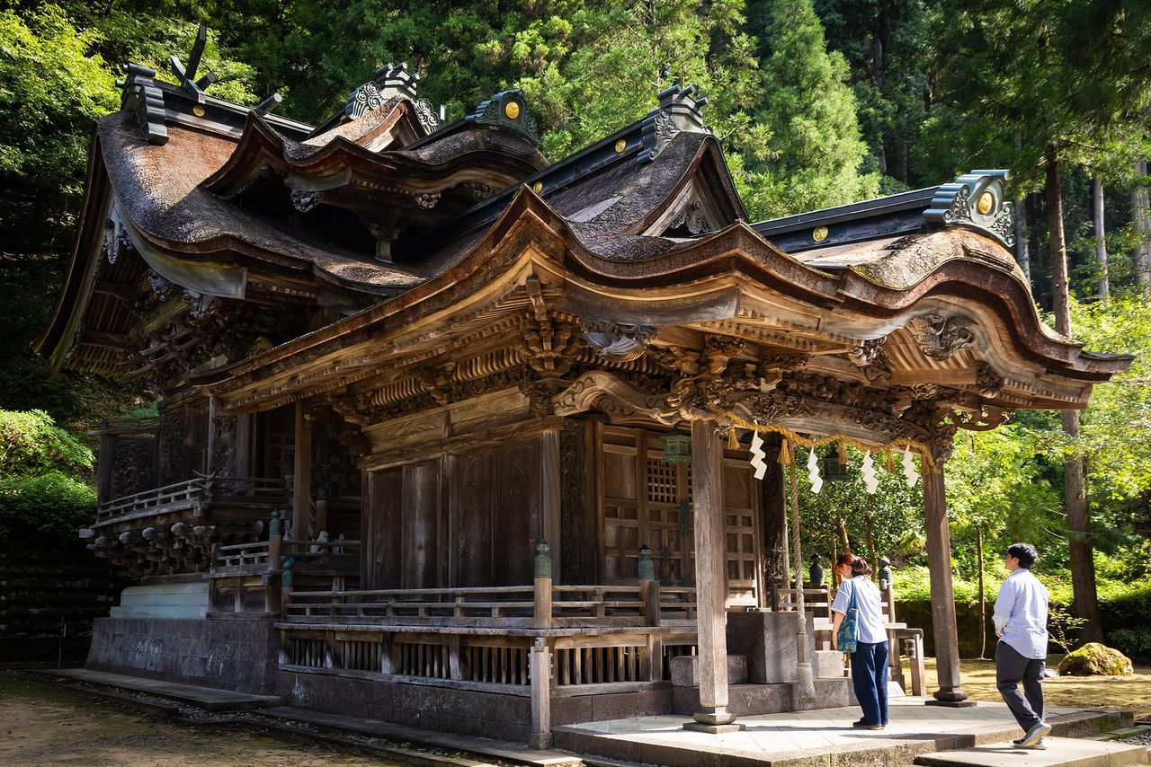 屋檐下雕刻精细,让人想起江户时期神佛融合的灵庙建筑。正殿侧面的雕刻以中国神话故事为主题,尤其精彩。这座建筑不仅兼具两神社的正殿和拜殿,还通过复杂精巧的构造展现了宗教圣地神佛融合的庄严静穆,不虚其名。