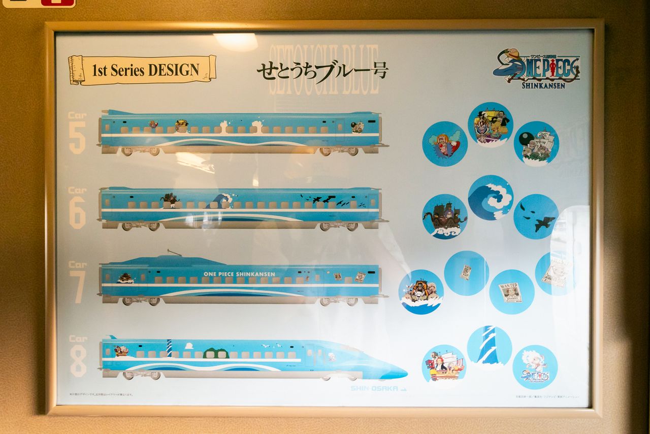 该系列运行的第1辆列车是“濑户内蓝号”,车身涂装灵感来自从山阳新干线车窗看到的美丽海洋。从平安时代到战国时代,在濑户内海沿岸活跃着以村上海盗(水军)为首的众多海盗。于是,设计者效仿路飞一伙一往无前的“伟大航路”,将濑户内海沿岸这条线路称为“伟大线路”,让乘客们在停靠站寻得观光名胜和土特产品等“魅力宝藏”。