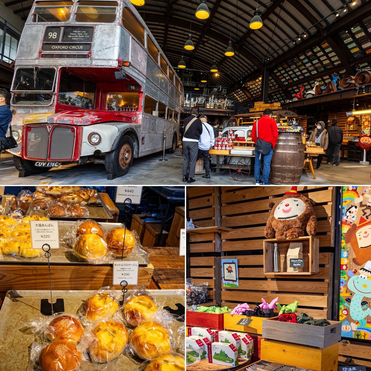 以车库为灵感打造的礼品商店中,还设有Club Hare在彦根市经营的面包工坊“J’oublie le temps”的产品销售区。旁边的美食广场和餐车区除了有冰淇淋和团子,还有近江牛糯米拌饭、当地特色红魔芋汤、意式油炸饭团等。游客若以简餐解决午饭,那么其他时间就能尽情品尝比较各式甜点了。