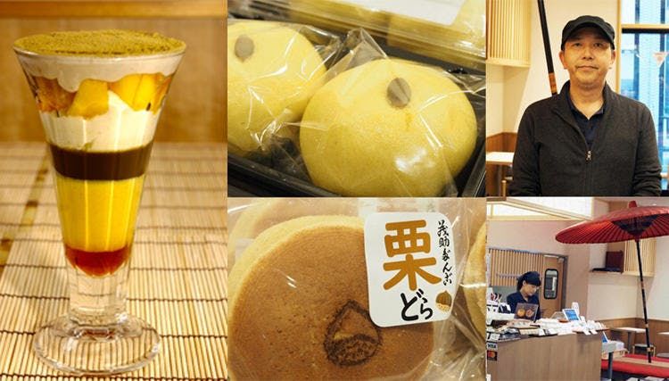 这里还准备有应季菜单。夏季是刨冰,到了秋天,则有白薯、栗子、南瓜和柿子。满载了秋天气息的“奢侈秋季冷冻果”(980日元/含税)登场。另外,也可以享用“抹茶拿铁”“栗子小豆粥”等秋冬菜谱。在礼物选择上,馅料和外皮都使用了足料栗子的“栗子铜锣烧”、能够充分享受南瓜美味的“本南瓜馒头”等都是值得推荐的秋季礼物。