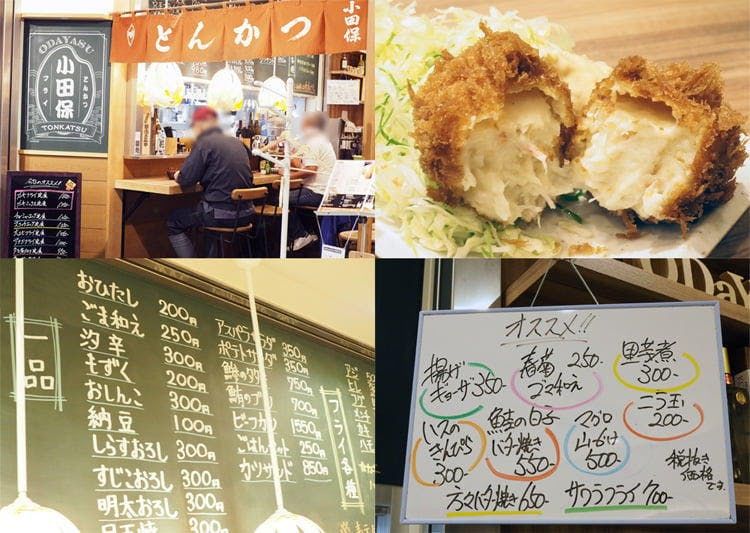“市场饭”,是在市场工作的人们赖以维持体力的餐食,如果你也想尝试一下,那就去“猪排小田保”。这家餐馆原本经营猪排,但也制作竹莢鱼、虾、蟹、贝类、牡蛎、河豚、海鳗等水产的油炸食品,而且店主会用当天从市场买来的鱼烹制炖菜和刺身等,份饭每天不重样。另外还有很多小菜,如“小沙丁鱼萝卜泥”“大块金枪鱼”“剁竹莢鱼”等,市场工作人员在早上的工作结束后小酌一杯时,它们都是大受欢迎的下酒菜。这么多美味,到底吃什么好还真让人难以决定呢!