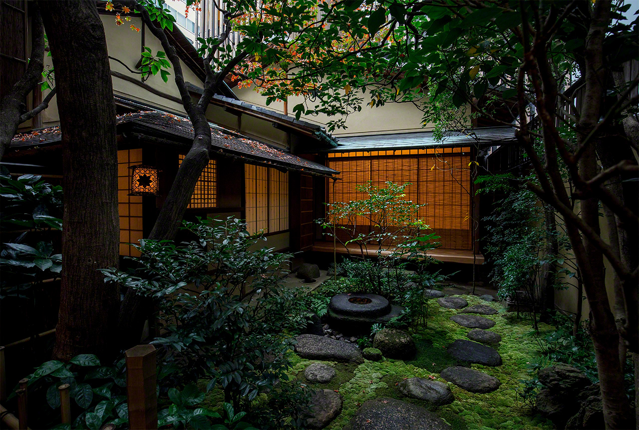 这座私家茶室拥有250年历史,位于大阪商务区的正中央。从外面街道上难以窥视到的这个隐秘空间,宛若钢筋水泥丛林中一片绿洲。在这个静谧的空间外,高楼大厦林立,旧楼不断被新楼替代,营造出一种体现了佛教“诸行无常”的景观。