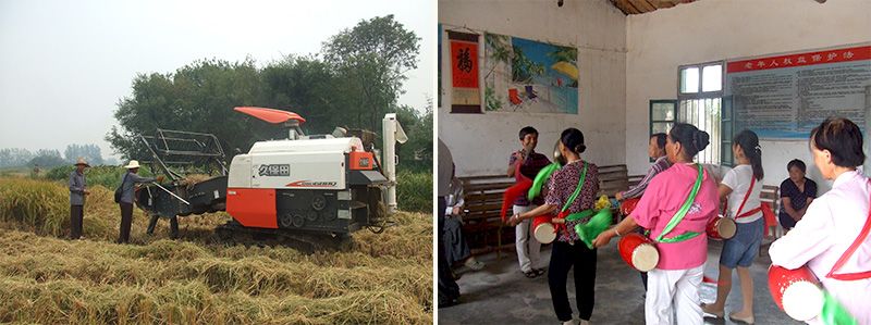 笔者曾走访过湖北省沙洋县新贺村,当地通过公共投资改造了田地,走上了农业生产机械化道路。越来越多农户委托拥有机械的人员收获作物。由于年轻人纷纷外出打工,老龄化问题正迅速加剧。图片右侧是老年协会的成员们正在展示腰鼓演奏和舞蹈。