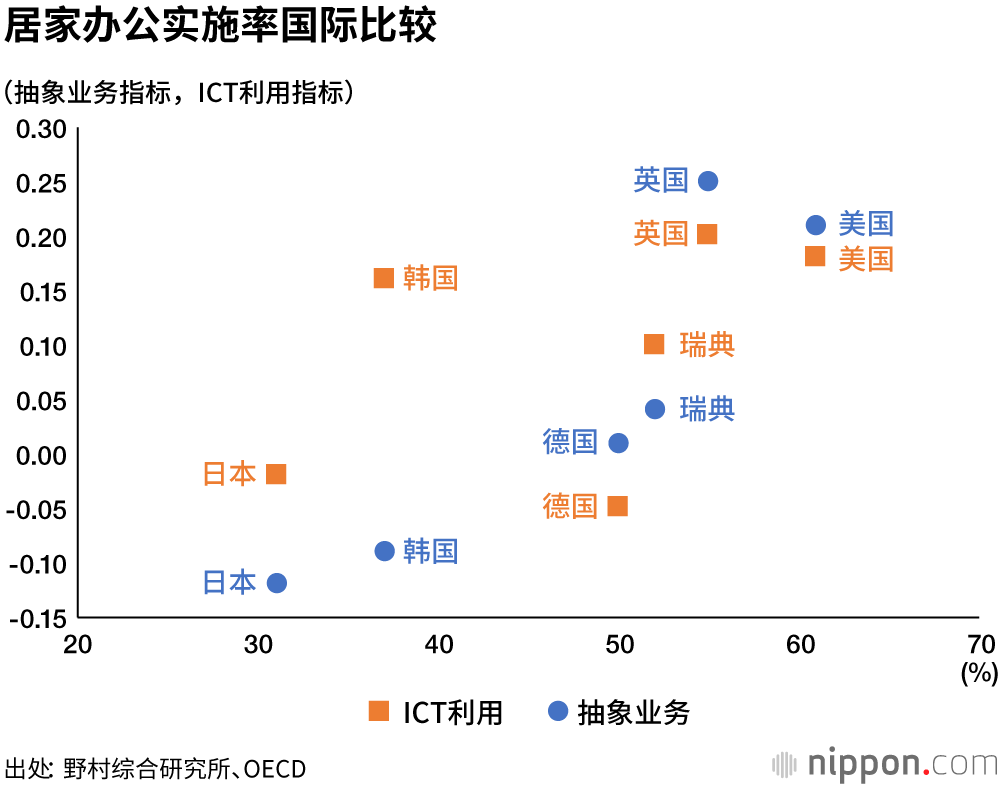 由于调查对象和时间不同,所以居家办公率和水平与前面提到的《日本家庭开支固定样本调查》存在差异,但观察图中的蓝点可以看出,从国际比较来看,日本的居家办公率最低,仅有30%左右,相当于最高的美国(60%)的一半。更值得注意的是,居家办公率越高的国家,抽象业务指标明显越大,日本的抽象业务占比最小。