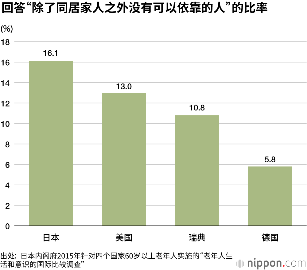 这一倾向直到现在也没有改变。日本内阁府于2015年针对四个国家60岁以上老年人实施了“老年人生活和意识的国际比较调查”。其中,日本回答“除了同居家人之外,没有可以依靠的人”的受访者比率很高,可见有很多日本人在社会中处于孤独无助的状态。
