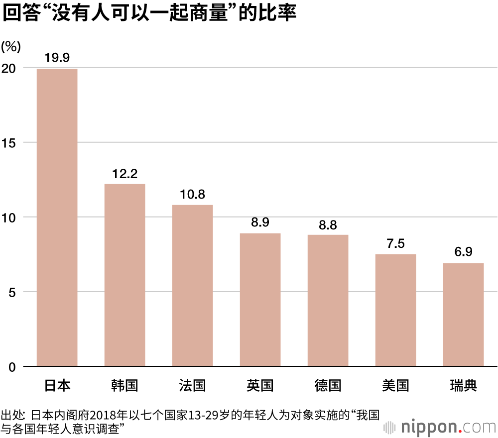 年轻人的情况也与此类似。日本内阁府2018年以七个国家的13-29岁年轻人为对象,实施了“我国与各国年轻人意识调查”。其中,针对“有烦恼或担忧时想找谁去商量吗”的设问,回答“不和任何人商量”的受访者,在日本人中比例出奇高。