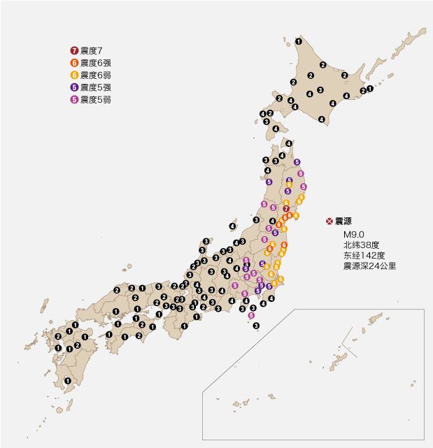 造成东日本巨大震灾的东北地区太平洋海域地震,发生于2011年3月11日(星期五)14时46分18秒,震源位于日本的三陆海域(牡鹿半岛东南偏东约130公里附近),深度约24公里,里氏震级9.0,是日本观测史上规模最大的地震。美国地质调查所(USGS)称,此次地震规模之大,在1900年以来世界发生的地震中排列第四。