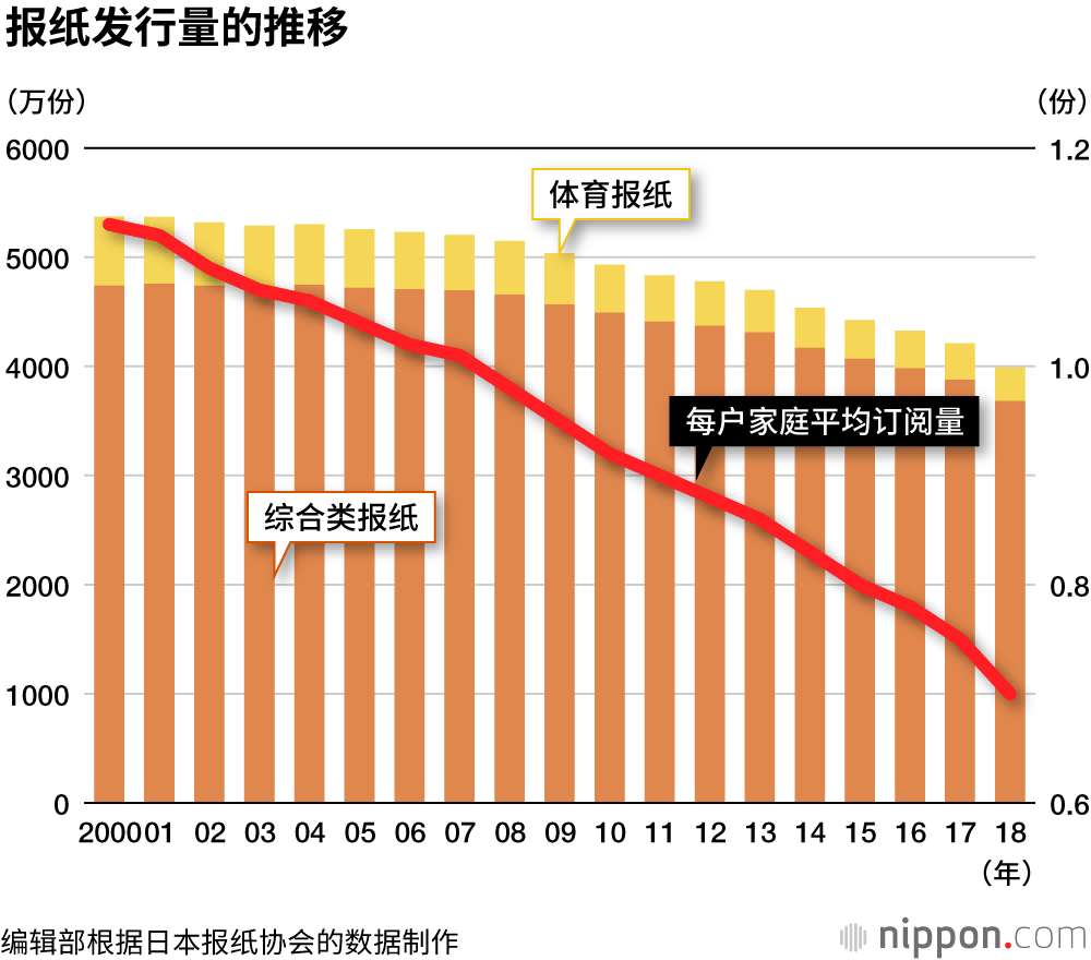 包括体育报纸在内的报纸发行量首次跌破4000万份,每户家庭平均订阅量为0.7份。
