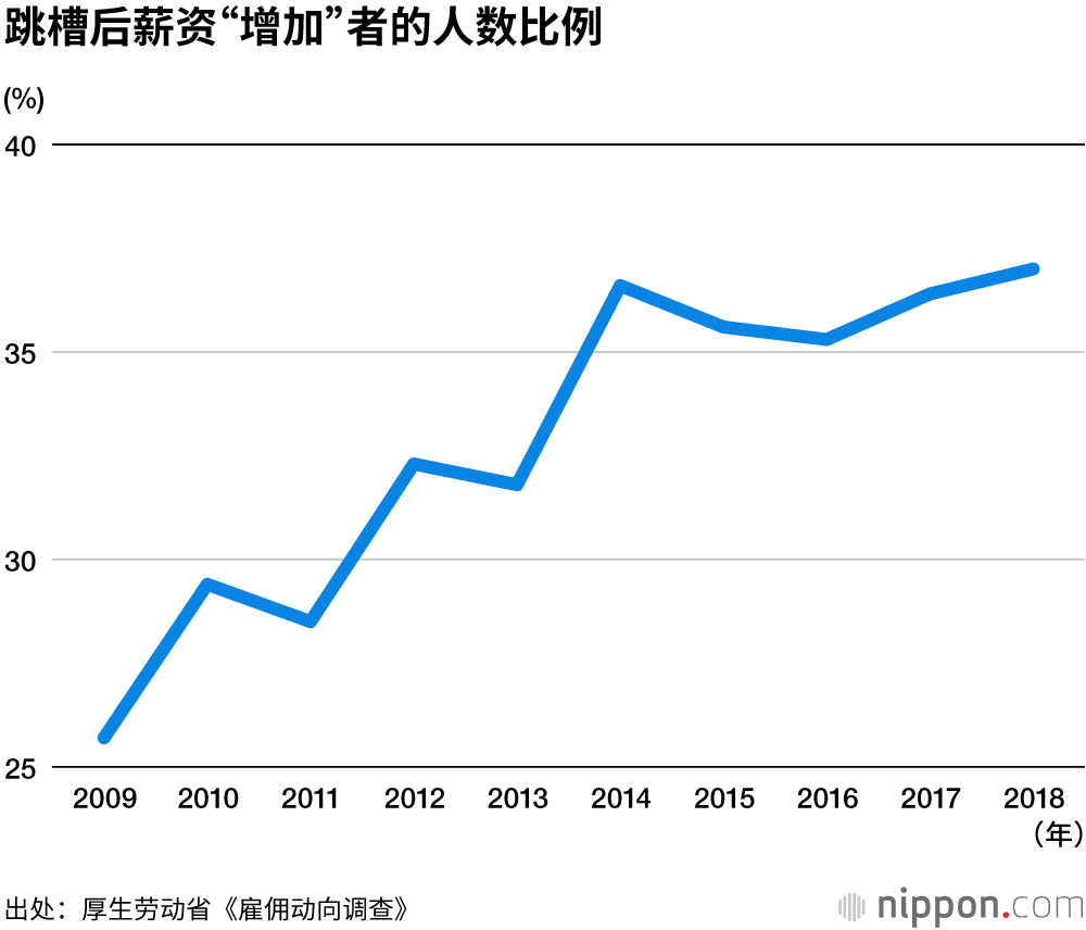 截至2018年1月1日,日本的劳动力总数为4970万人,其中“入职率”(即初次参加工作及跳槽者的人数比例)较上年减少0.6个百分比,为15.4%,“离职率”(辞职或被解雇的人数比例)同比则减少0.3个百分比,为14.6%。在全体新员工当中,跳槽人员为495万人,也就是相当于日本劳动力总数的十分之一。