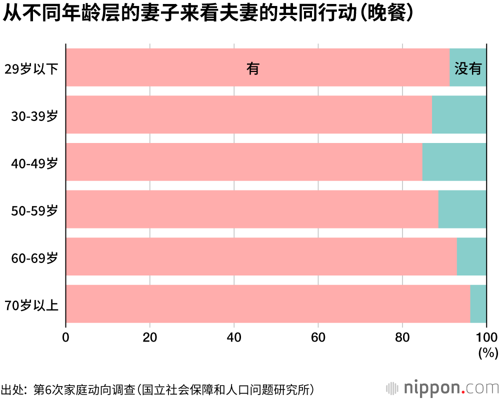 如果从不同年龄层的妻子一方来观察夫妻的共同行动,回答“共进晚餐”的受访者在所有年龄层中都占到了8~9成;而在“性行为”方面,只有29岁以下年龄层中的肯定回答超过半数。