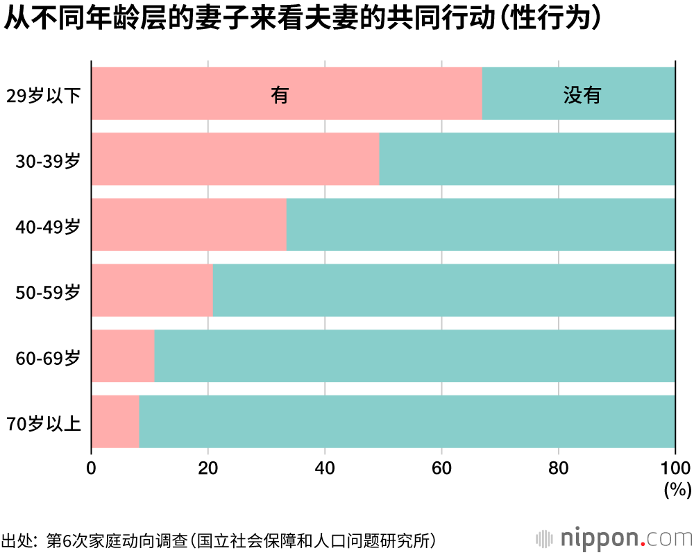 日本国立社会保障和人口问题研究所每5年实施一次的《全国家庭动向调查》显示,关于夫妻的共同行动,虽然近九成受访者表示会“共进晚餐”,但只有25%会“做爱”。这个结果凸显了日本夫妻间所谓的“朋友以上,恋人未满”的状态,也就是介于朋友和恋人之间的关系。
