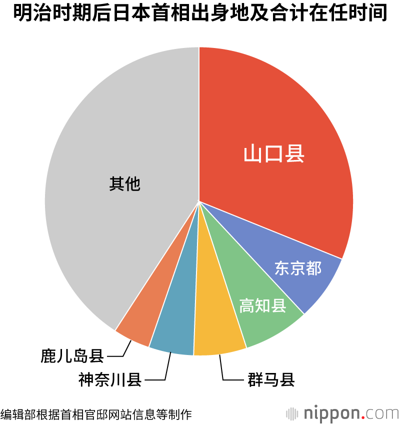 从日本第一任首相伊藤博文算起,迄今共有八位首相是山口县人。他们的合计在任时间达到了15268天,意味着1855年12月22日伊藤博文就任首相以后,三分之一的时间都是由山口县人在担任首相。