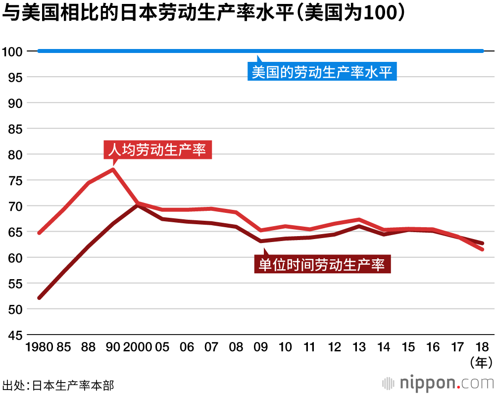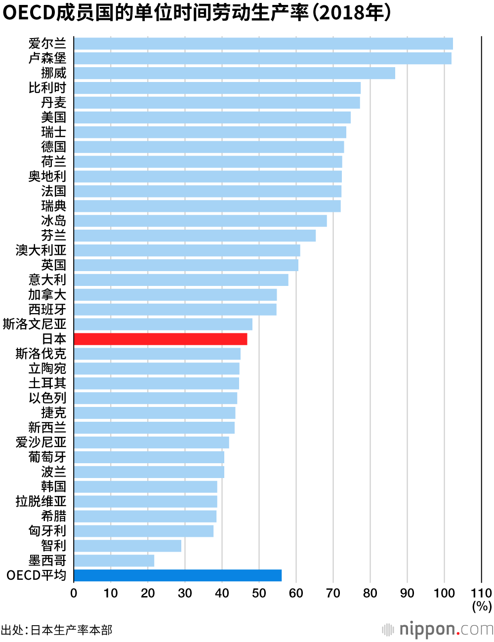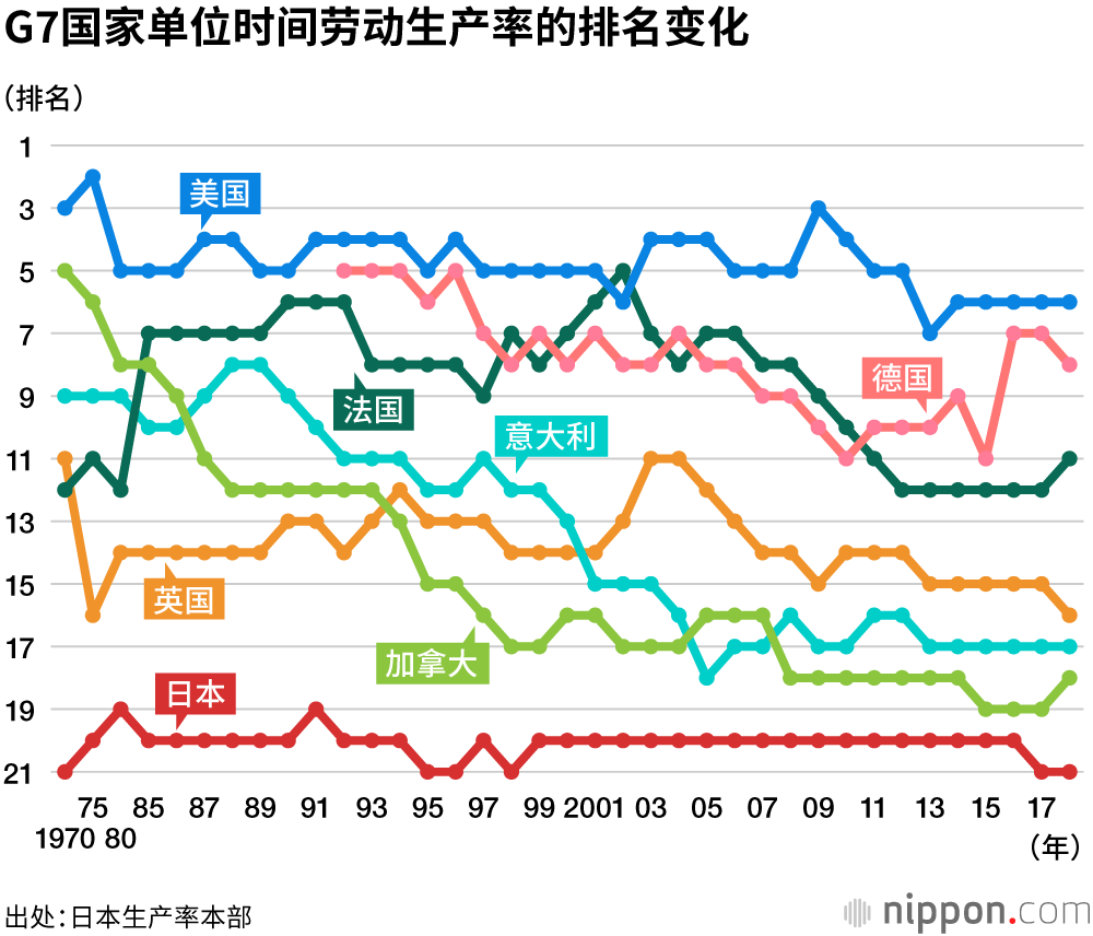 日本生产率本部公布的《劳动生产率国际比较》显示,基于经济合作与发展组织(OECD)的数据,2018年日本劳动生产率为一小时46.8美元(购买力平价换算为4744日元),在36个OECD成员国中排名第21位。这个数值不到爱尔兰(102.3美元)和卢森堡(101.9美元)的一半,也只有美国(74.7美元)的60%。日本政府将“劳动方式改革”作为重要课题,力图提高生产率,而自从留有调查记录的1970年以来,日本就一直铁打不动地稳坐七国集团(G7)的末席。