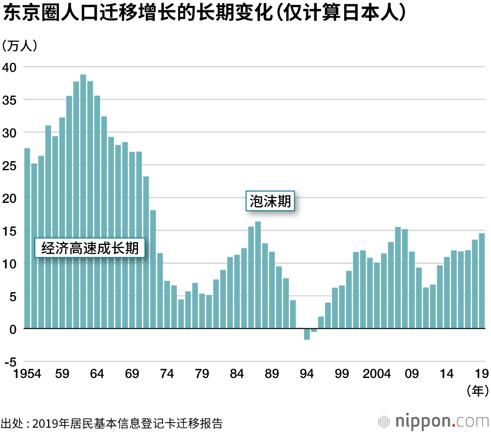 包括外国人在内的这项人口迁移统计是从2014年开始的,迄今连续6年都处于入多于出的状况。如果只看仅限于日本人的长期统计,那么在1996年泡沫经济破裂后出现了一时性人口迁移负增长后,东京圈连续24年都是迁移净增长。其中,东京的人口迁移增长数量为8 2982人,占整个东京圈的55.8% 。