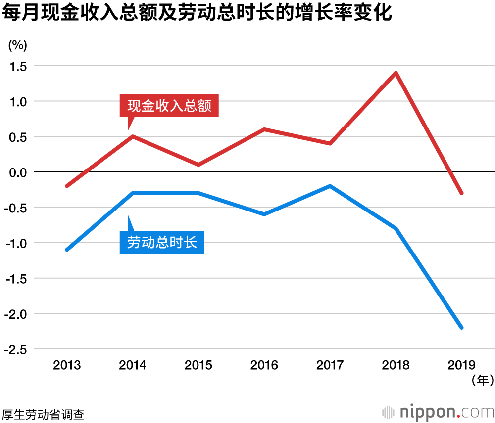 日本厚生劳动省的每月劳动统计调查(估算值)显示,2019年日本劳动者的人均“现金收入总额”(货币工资)为每月322689日元,比上年度减少了0.3%,是六年来的首次下降。人均劳动时长同比下降了2.2%,为每月139.1小时。劳动方式改革取得一定进展,限制员工加班的企业越来越多,这被认为是劳动者收入减少的重要原因。