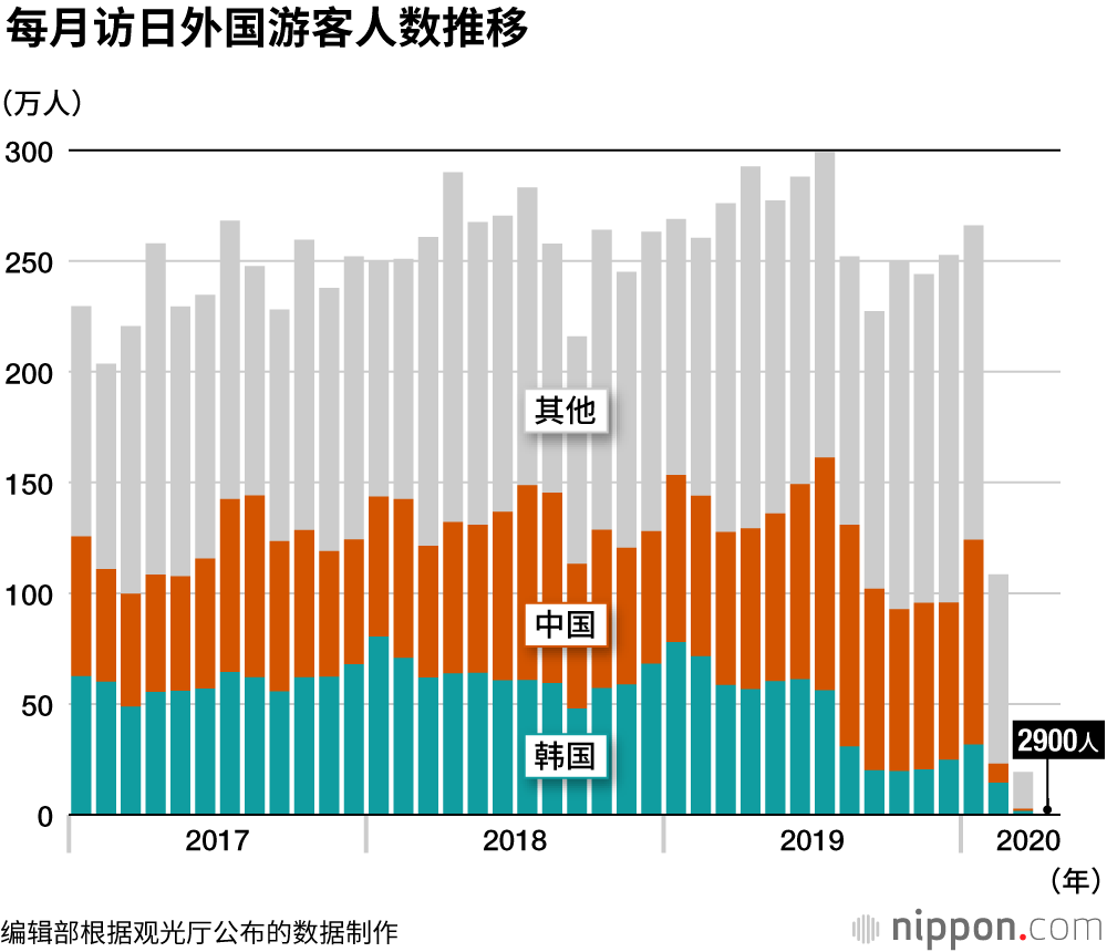 日本政府观光局的统计显示,4月份访日外国游客人数较去年同期减少99.9%,为2900人。这是自1964年开始该项统计以来首次低于1万人。受新冠肺炎疫情蔓延的影响,许多国家实施了禁足令并限制出国,采取了实质意义上的锁国政策。不仅是日本,全球都陷入了出入境游需求消失的境况。