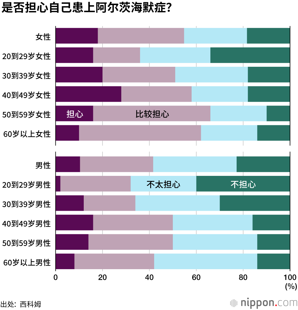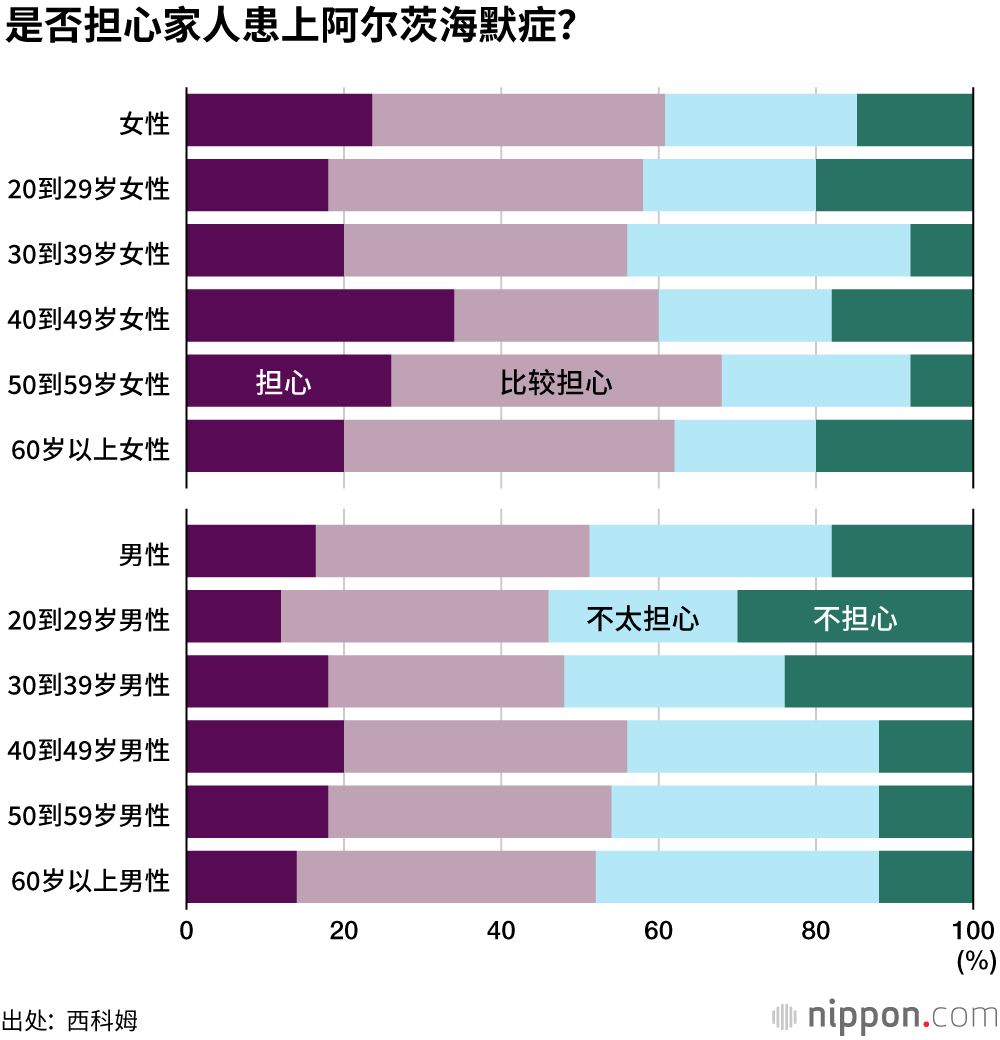 当被问及是否会担心“自己患上阿尔茨海默症”时,表示“担心”或“比较担心”的女性受访者占比合计达到54.8%,男性为41.6%。另一方面,担心“家人患上阿尔茨海默症”的女性受访者比例为60.8%,男性为51.2%,可以看出相较于自己,更担心家人。