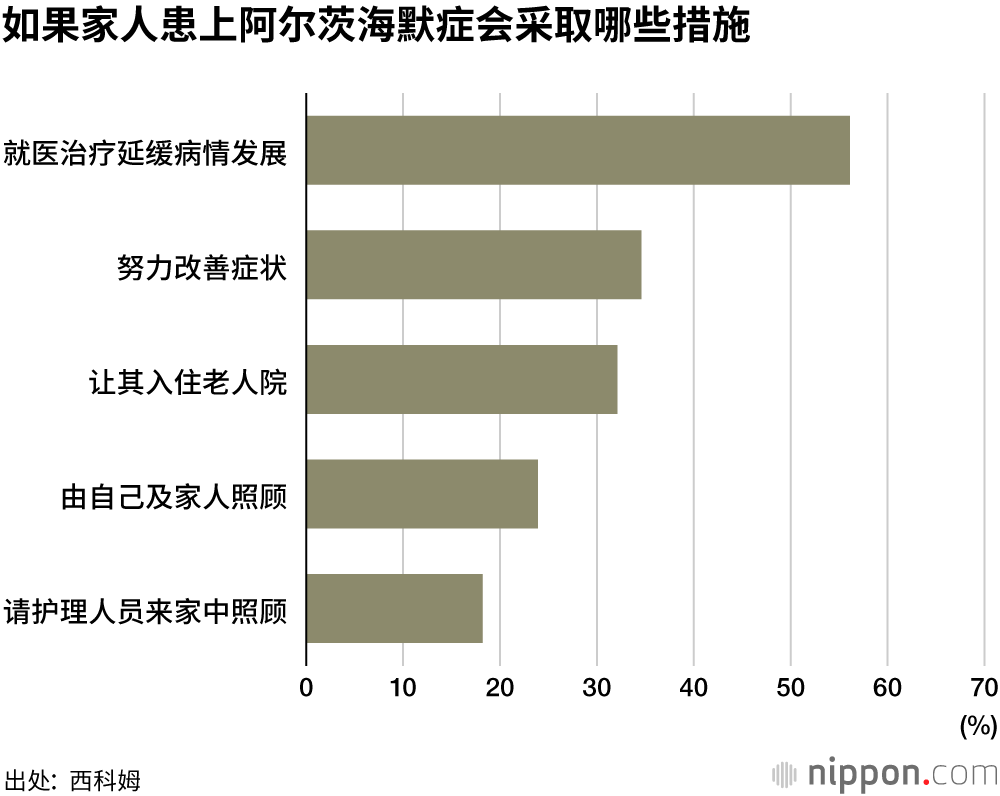 关于“如果患上阿尔茨海默症”会采取什么行动这一问题,受访者普遍重视的是避免病情恶化,选择“就医治疗延缓病情发展”“努力改善症状”等措施的人较多。或许是因为担心给家人增加负担,仅有12%的受访者表示如果自己患上阿尔茨海默症,“会在家中让家人照顾”。