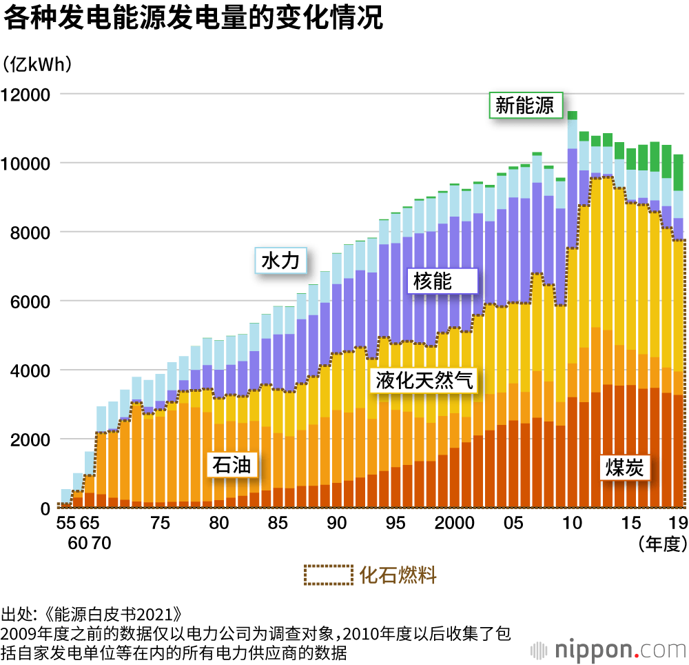 与2018年度相比,化石燃料的占比略微减少,新能源占比有所增加,但日本四分之三的发电量依然来自化石燃料。其中,被视为最大问题的煤电占比始终处于30%以上的高位。