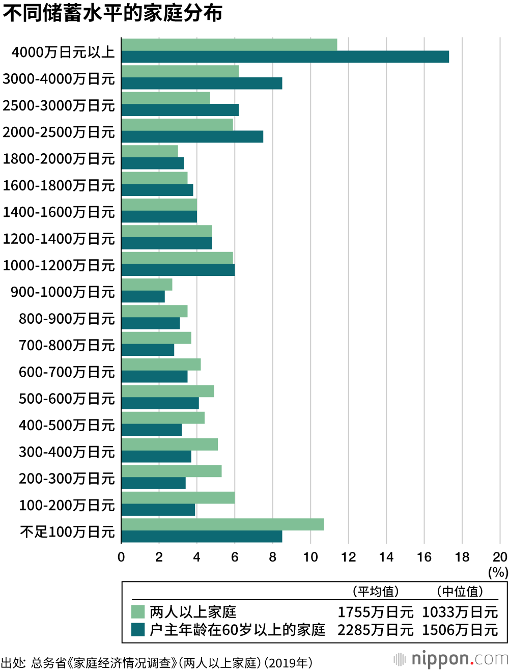 两人以上家庭的储蓄额中位值为1033万日元,而户主年龄在60岁以上的家庭为1506万日元,大约是前者的1.5倍。