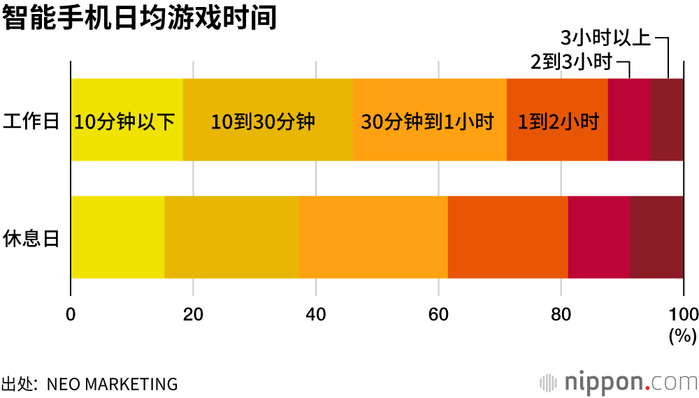总部位于东京的NEO MARKETING公司针对800名玩过手机游戏的10到59岁男女实施的问卷调查结果显示,大部分受访者每天游戏时间为“10到30分钟”或“30分钟到1小时”,大约有三成的受访者工作日游戏时间超过1小时,有近四成受访者休息日游戏时间超过1小时。
