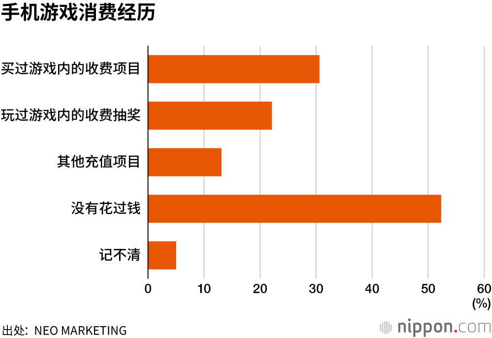 受访者中52.3%的人表示“没有在手机游戏上花过钱”,超过四成的人表示花过钱;30.6%的人表示“买过游戏道具”,22.1%的人表示“玩过收费抽奖(购买随机道具)”。