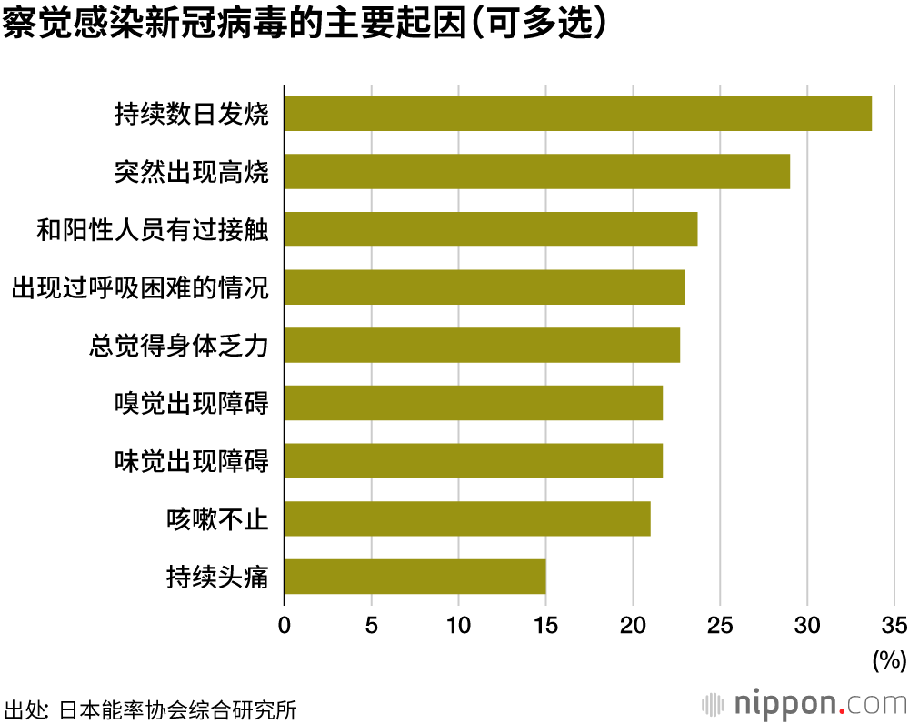 日本能率协会综合研究所公布的新冠病毒既往感染者意识调查结果显示,许多患者是因为发烧、曾与阳性人员有过接触或呼吸困难发现自己感染病毒的,认为自己是在工作单位或餐饮店感染的受访者占比合计接近半数。
