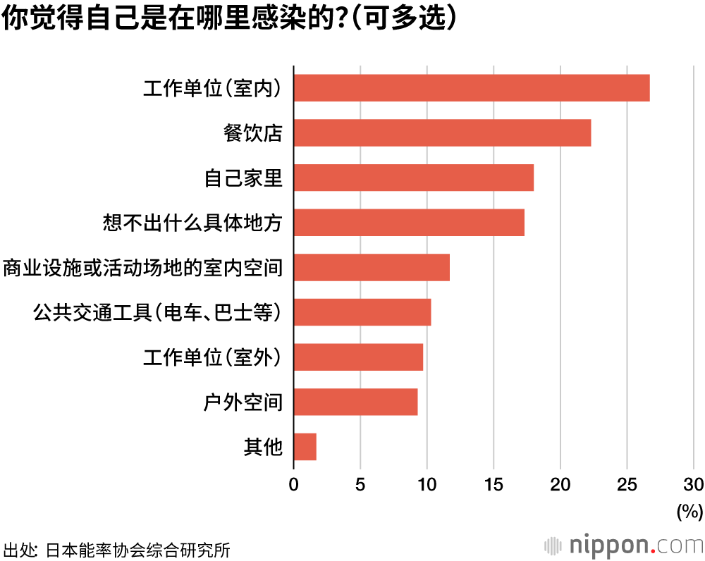 针对“你觉得自己是在哪里感染的”这个问题(可多选),回答“工作单位(室内)”的受访者最多(26.7%),其次是餐饮店(22.3%)和自己家里(18.0%)等。另一方面,也有17.3%的受访者表示“想不出什么具体地方”。
