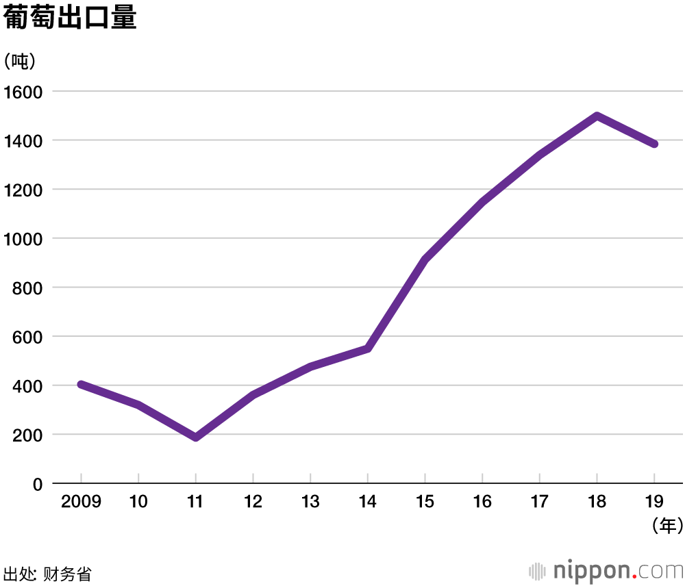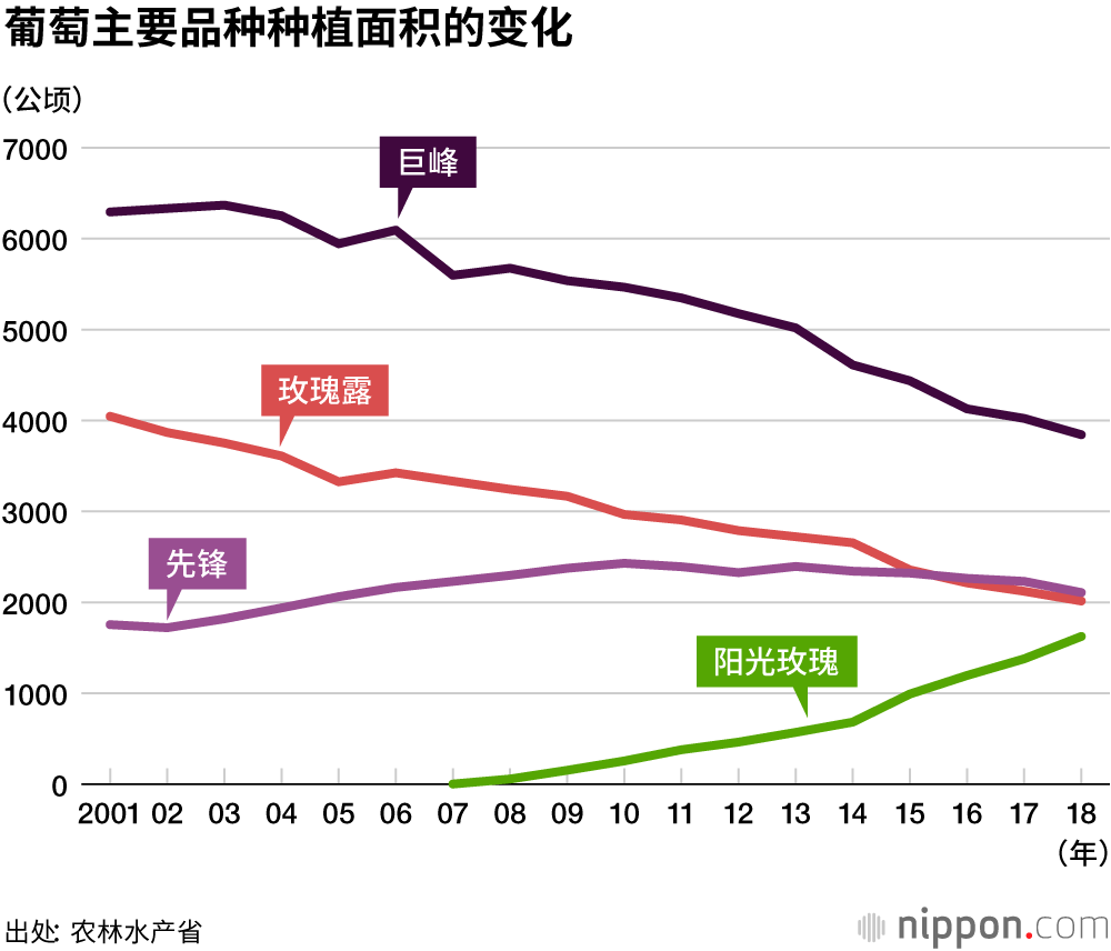 自2014年以来,日本葡萄的出口量一直在快速增长。2018年创下了历史最高纪录。出口对象方面,面向中国香港、中国台湾和新加坡等地区和国家的出口量占了大半,颗粒巨大、美观体面的先锋(Pione)葡萄和阳光玫瑰等品种作为馈赠佳品十分畅销。此外,为了扩大出口,日本还在加快培育颗粒不易脱落、耐存放的品种。