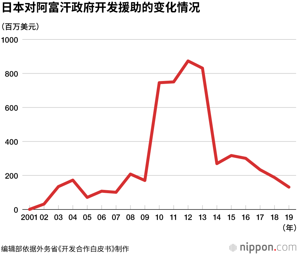 伊斯兰原教旨主义运动组织塔利班推翻原政权后,阿富汗形势开始变得动荡不安。日本外务省发布的数据显示,最近20年间,日本共计援助阿富汗69亿美元(约合7590亿日元),作为主要援助国,为阿富汗的重建复兴提供了支持。