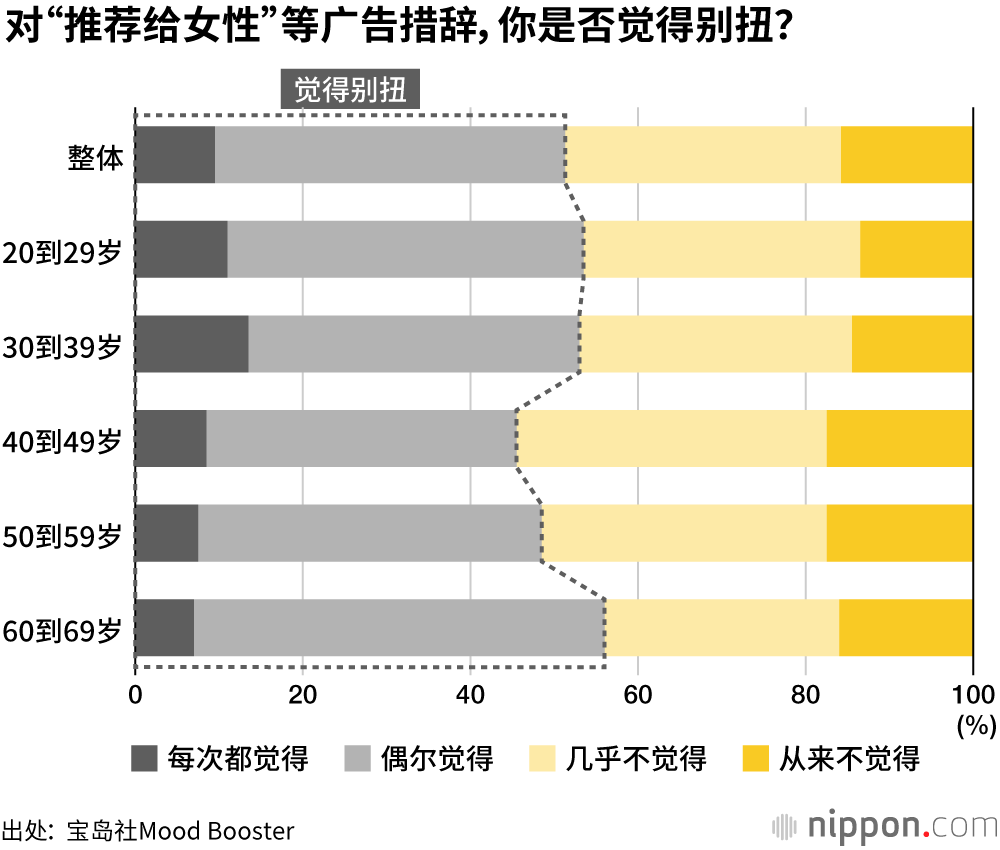 宝岛社针对1000名20到69岁女性实施的调查显示,半数女性对电商平台、杂志广告页上出现的“对女性来说也很简单!”“女性也会喜欢”之类的措辞感到别扭。为促销而使用的“女性”一词,反倒有可能降低受众的商品购买意愿。