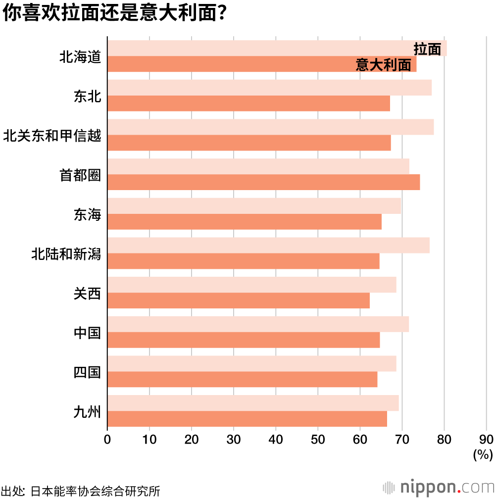 “拉面”在北海道最受欢迎,支持率高达80.6%,北关东和甲信越地区为77.5%,东北地区为77.0%,北陆和新潟为76.5%。意大利面在首都圈最受欢迎,支持率为74.2%,北海道为73.4%,也超过了70%。
